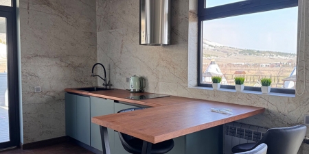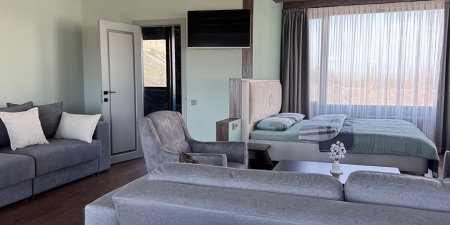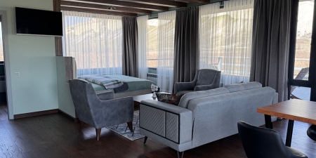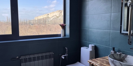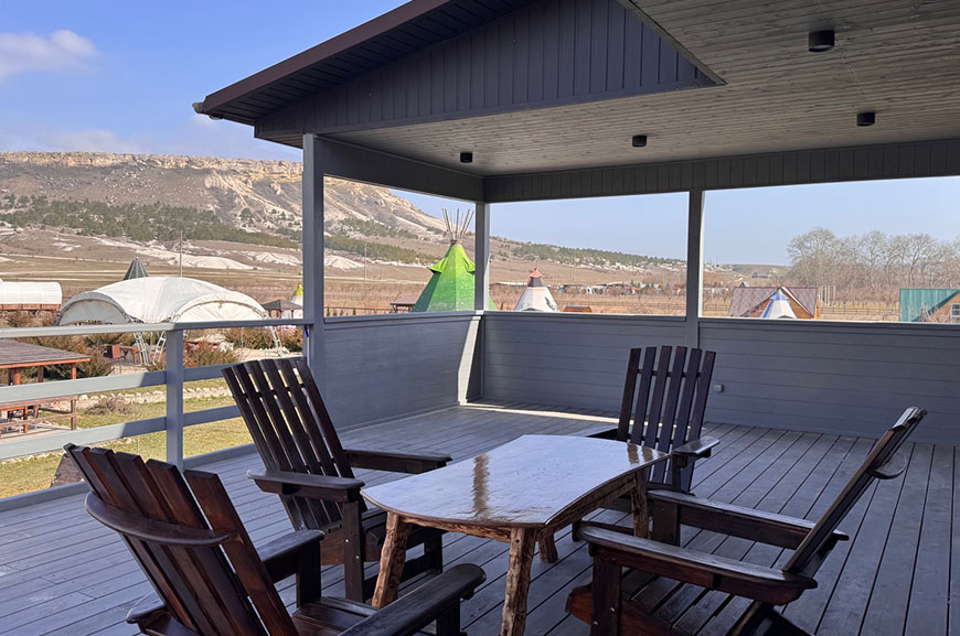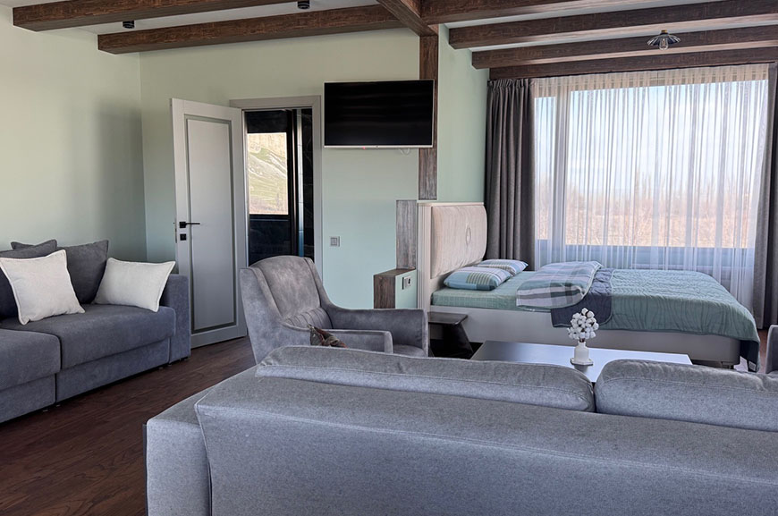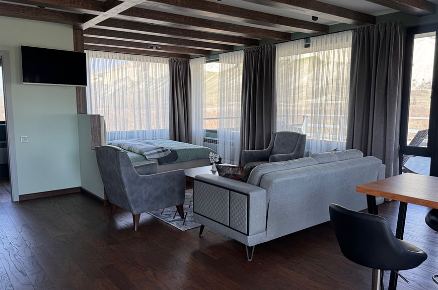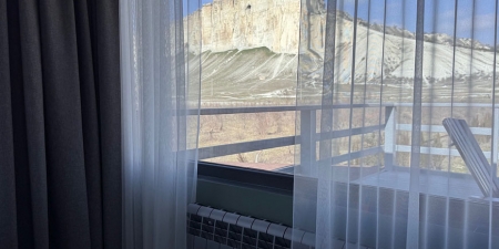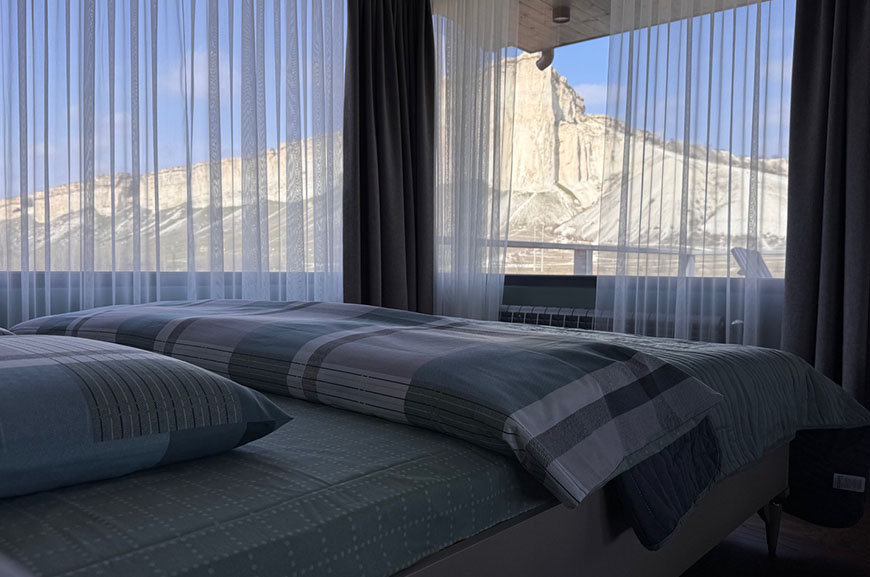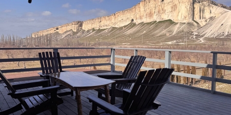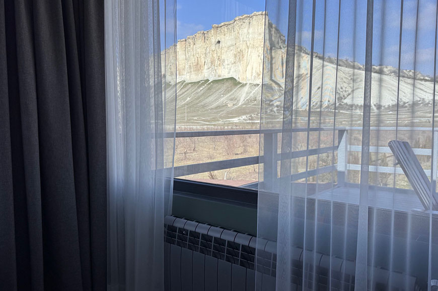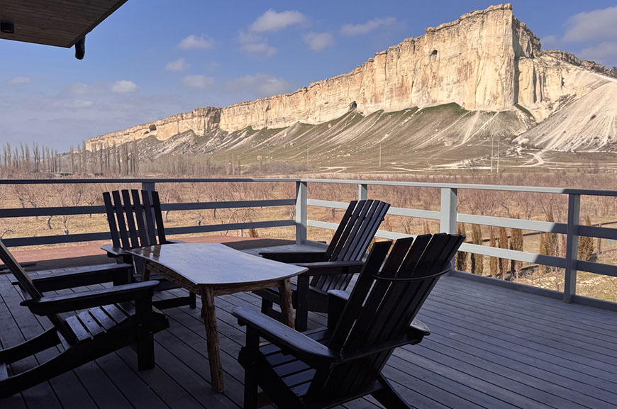 Из панорамных окон и с большой террасы открывается живописный вид на Белую скалу и горы.