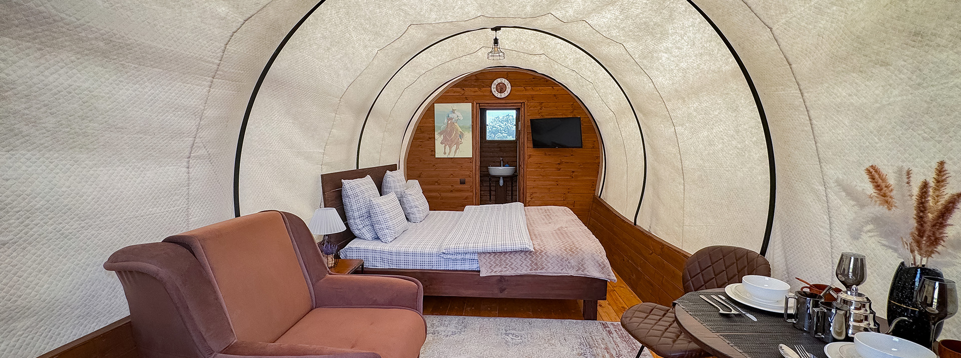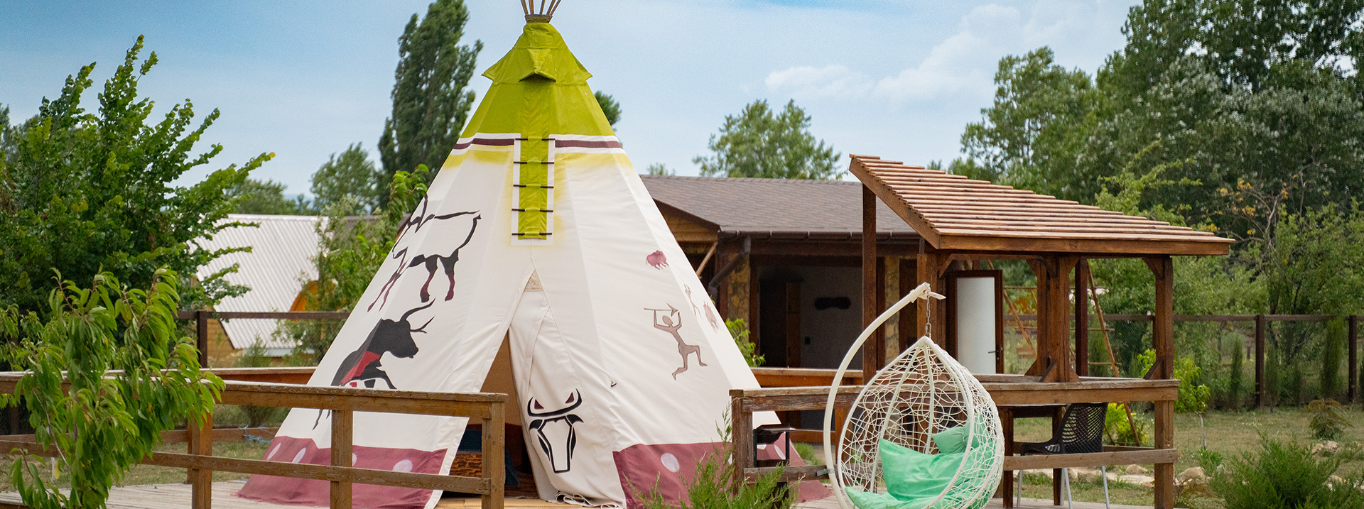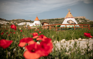 Наталия и Александр 5 августа 2025 г.Мы в восторге! Отдыхали с друзьями с 28-30 июня 2025г. Глэмпинг очень удачно расположен – территория большая, просторно, шикарная панорама на Белые скалы!!! Территория красивая, ухоженная, чистая - видно, что хозяева относятся с любовью к своему делу. Жили в вигвамах «Альпака» и «Лось». Просто класс – аутентично!!! Сами вигвамы прикольные – удобная кровать, хорошее постельное белье, пледы, чайник, вешалка, телевизор, кондиционер, холодильник, посуда – всё есть! У нас был свой санузел – большой, чистый, удобный. У каждого вигвама есть кресло – кокон, мангал, беседка, стол, стулья. Максимально всё продумано! На территории есть шикарное «лобное» место – вечером разожгли большой костер, пели песни под гитару, пришли соседи с других вигвамов, пили чай, знакомились, общались – это было очень атмосферно! Просыпаться с таким потрясающим видом – это прям ВАУ!!! Насмотреться невозможно, каждый раз поднимая глаза, у меня перехватывало дыхание. Мы застали разную погоду: и дождь, и солнце, ветер и тишь – всё прекрасно! На соседней базе брали квадроциклы и два часа катались по этим красивейшим местам, поднимались на вершину Белой Скалы – потрясно!!! Именно за такими эмоциями, как: восторг, удивление, восхищение, спокойствие и умиротворение, мы ехали. Спасибо хозяевам этого чудесного места! Мы обязательно сюда вернемся, когда возобновят фестиваль воздушных шаров!